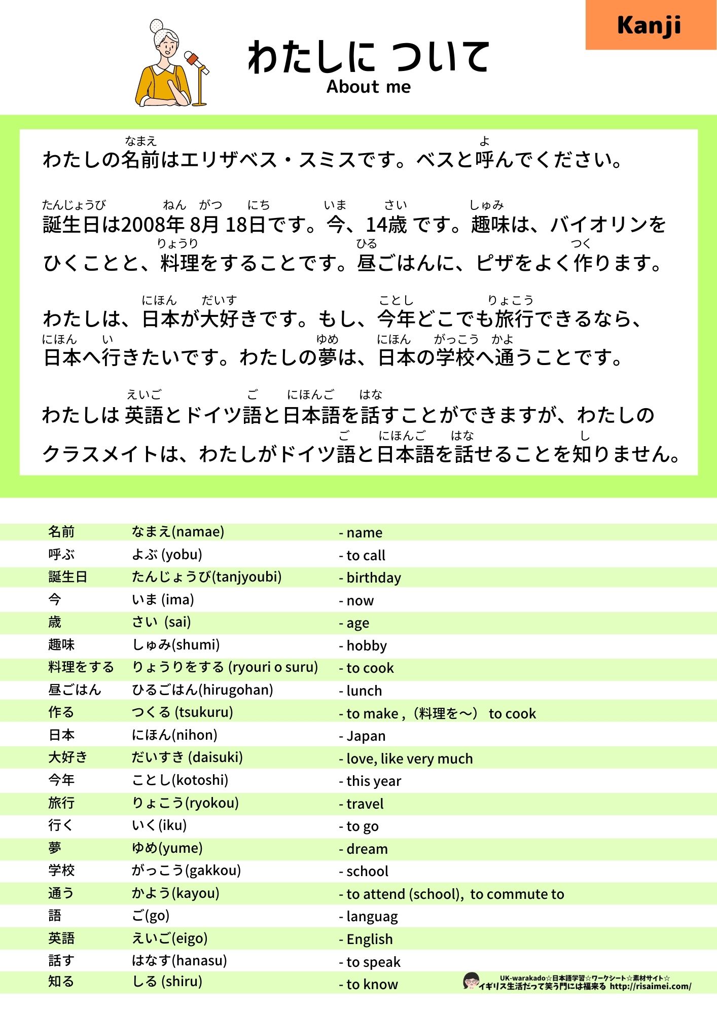 上記プリントの「漢字の読み」と英語の意味がリストになっています。読解の補助、または語彙・単語の学習等にお使いいただけます。(A4サイズ jpg形式1枚)