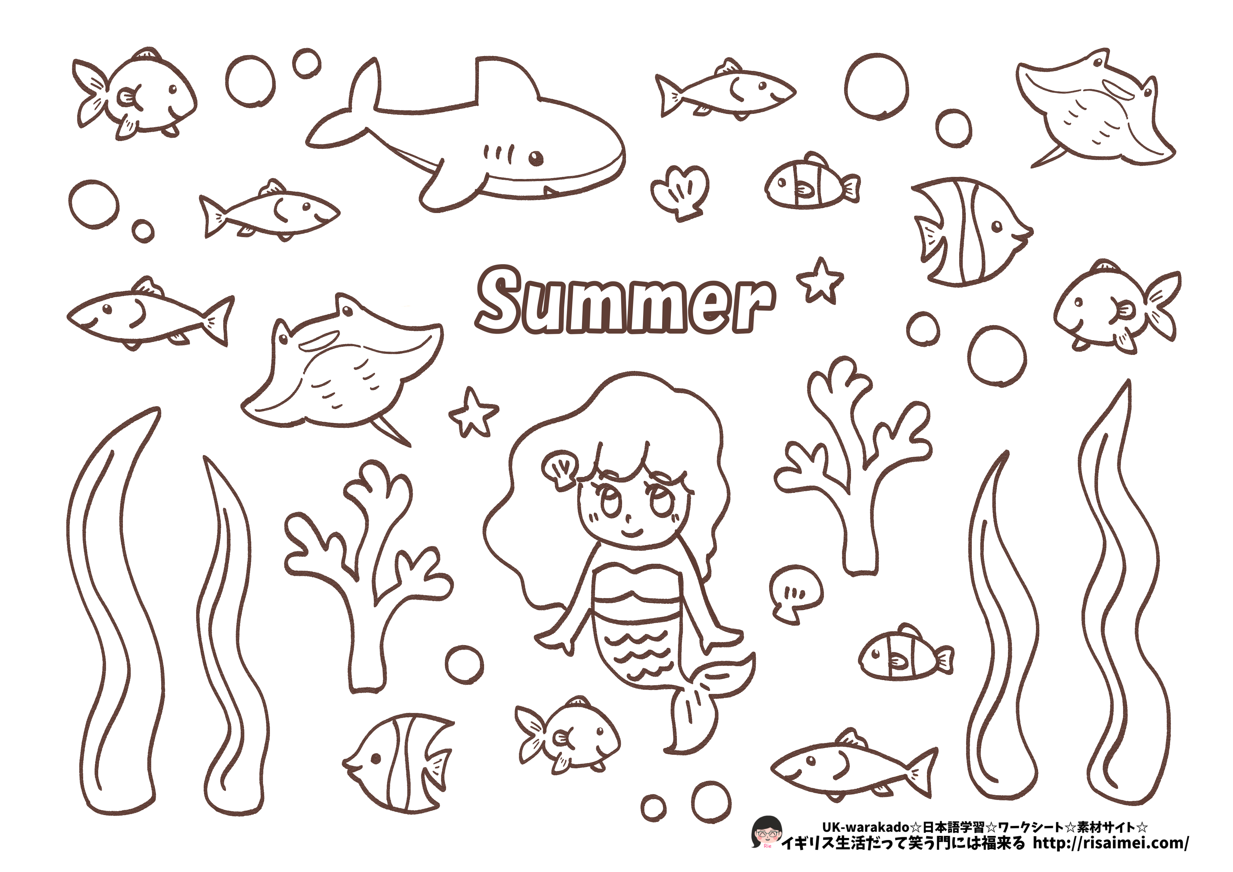 カードの飾りに使う魚や人魚は、色つきバージョンと色なしバージョン(塗り絵としてお使いいただけます)をご用意しました。