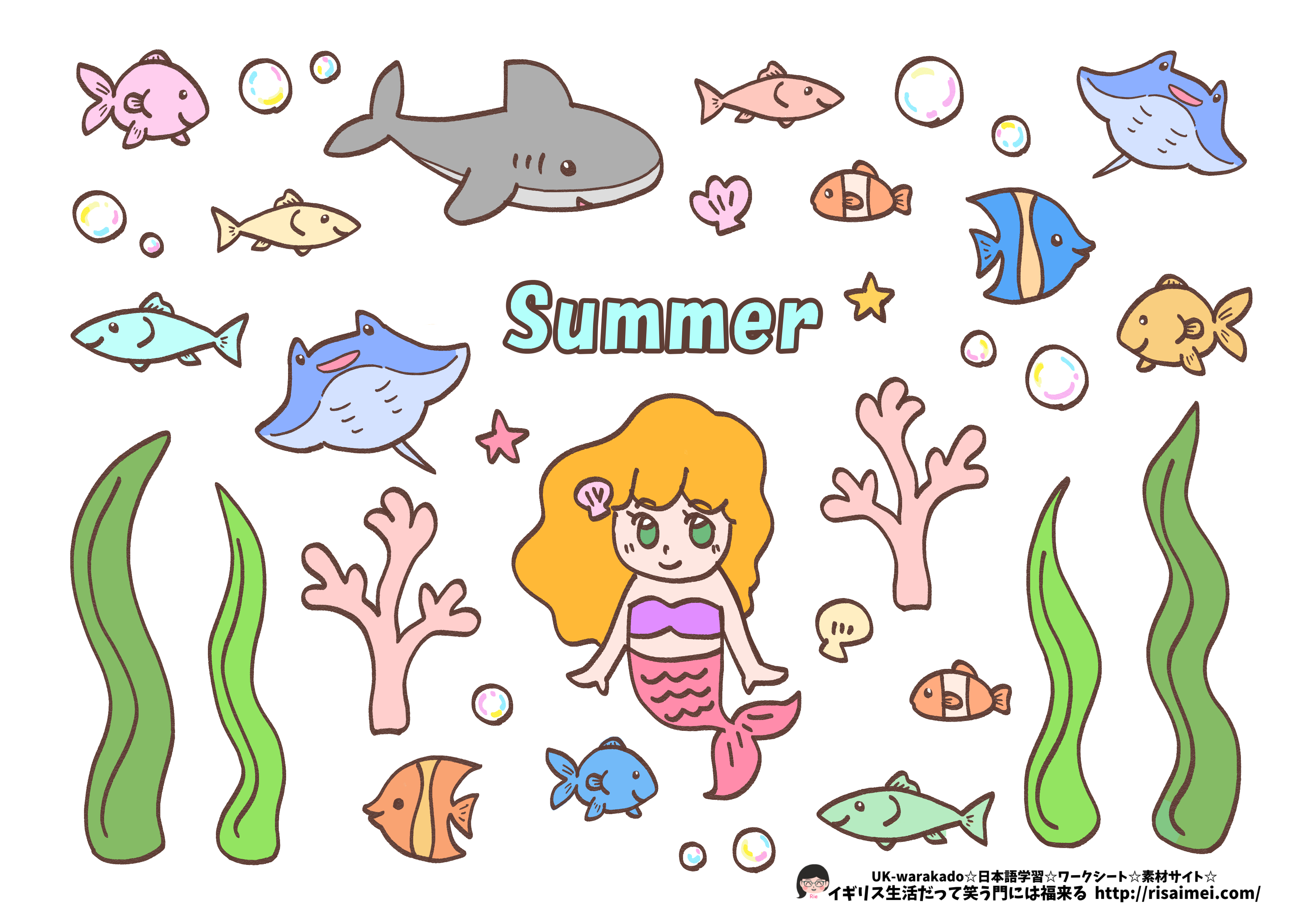 カードの飾りに使う魚や人魚は、色つきバージョンと色なしバージョン(塗り絵としてお使いいただけます)をご用意しました。